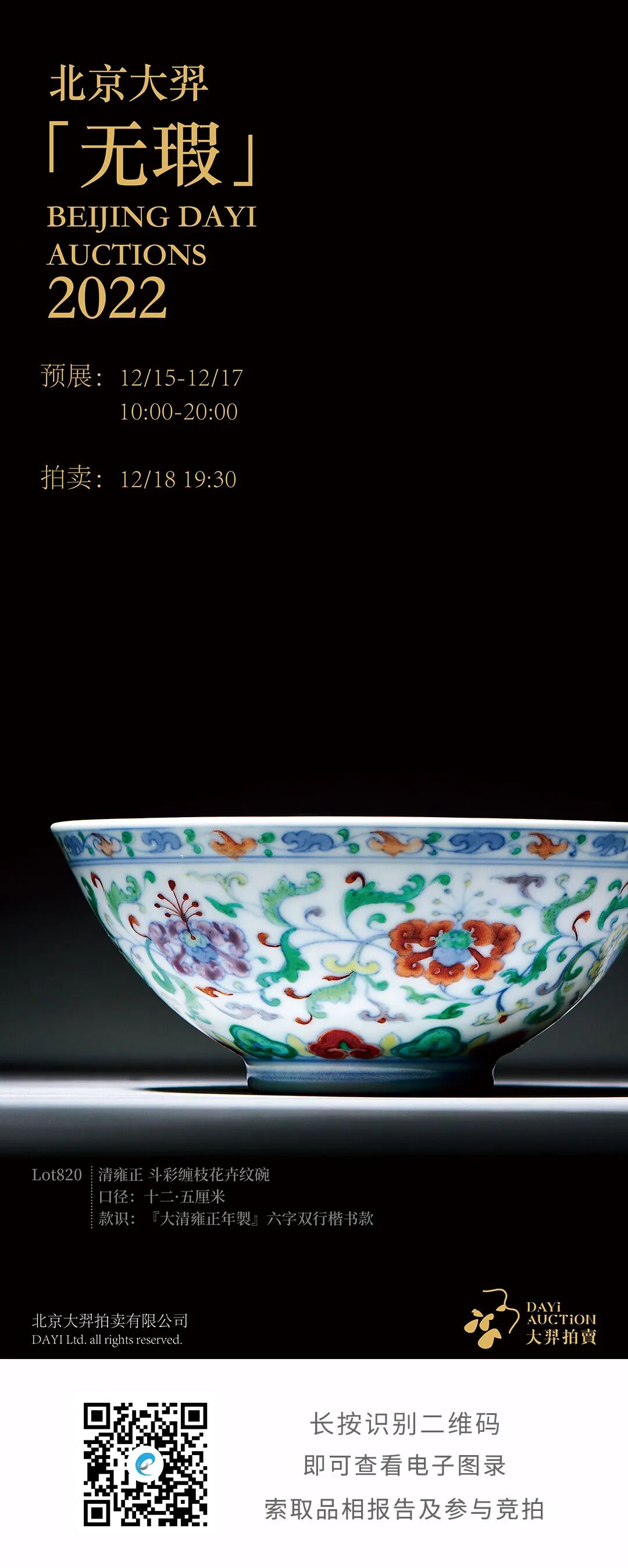 经过短暂的延期,北京大羿2022年秋季「无瑕」拍卖会已于近日开启精彩预展,并将于12月18日晚19点30分正式举槌,联拍在线全程直播,并提供实时同步竞拍技术和服务支持。