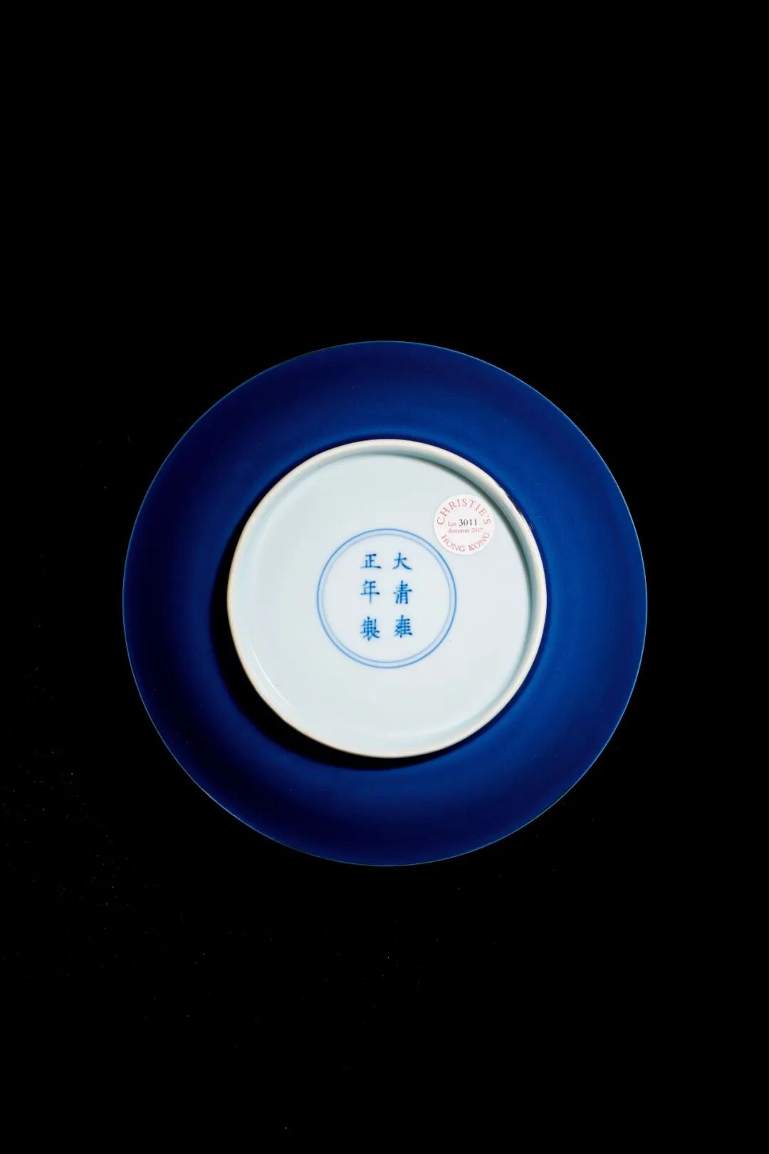 盘形规整,胎质细白致密。内壁施白釉,外壁施霁蓝釉,釉质肥腴,色泽沉静明快,尤如蓝宝石般璀璨深耀,口沿一线灯草口,为整器平添几分宁谧之趣。器底施白釉,玻璃质感强烈,为雍正时期蓝釉之标准器。