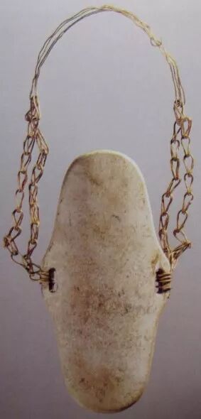 此玉臂鞲为白玉质,泛灰,表面磨光。椭圆形片状,正面略弧,背凹。左右两侧各有一个椭圆形长孔,孔内各系金链两条。