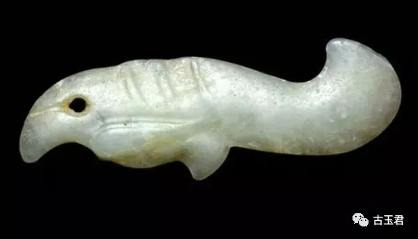 此展品为红山文化时期文物。长7.2厘米,宽2.7厘米。白玉,玉质温润,未盘摸,镜下可见沁坑及沁斑和沁洞,器表见散雾状黃沁及散点状白沁和灰黑沁,片状,最厚处约0.6厘米,两面纹饰相同,边缘呈刃状,梭形目,加边,两侧目稍有不同,,翘嘴,端头一孔不圆,由阴线连接,腹下宽阴文,衬出三道棱线,尾部边缘较锐,似有使用痕迹。现收藏于黑龙江红辽古玉博物馆。