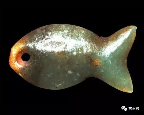 此展品为红山文化时期文物。长2.5厘米,宽2厘米。青玉,玉质温润,包浆饱满,鱼口部可见褐色沁,余可见白色及浅褐色沁,素面无纹,双尾叉开,头部一孔示眼及系挂,所有边缘均呈刃状,此器小巧玲珑。现收藏于黑龙江红辽古玉博物馆。