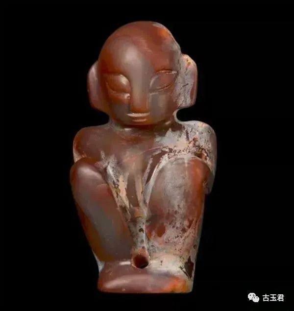 此展品为红山文化时期文物。高12厘米,宽7.6厘米,厚4厘米。红玛瑙,质地细腻紧密,颜色艳丽。圆雕而成,有褐色沁斑,作双手抚膝,大眼,双目正视前方,眉骨高凸,大耳,小嘴,光头,呈蹲坐状。制作精美,完好无损,是唯一一件用红玛瑙雕琢的玉人,对红山文化的研究具有重要的价值。现收藏于黑龙江红辽古玉博物馆。