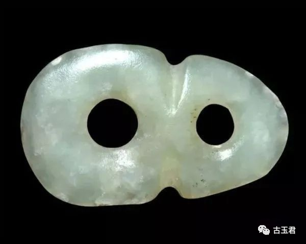 此展品为红山文化时期文物。长3.8厘米,宽3.3厘米。白玉,玉质温润,包浆饱满,可见黄白沁,上下各钻一孔,内外均呈刃状,此器小巧玲珑,造型甚佳。现收藏于黑龙江红辽古玉博物馆。