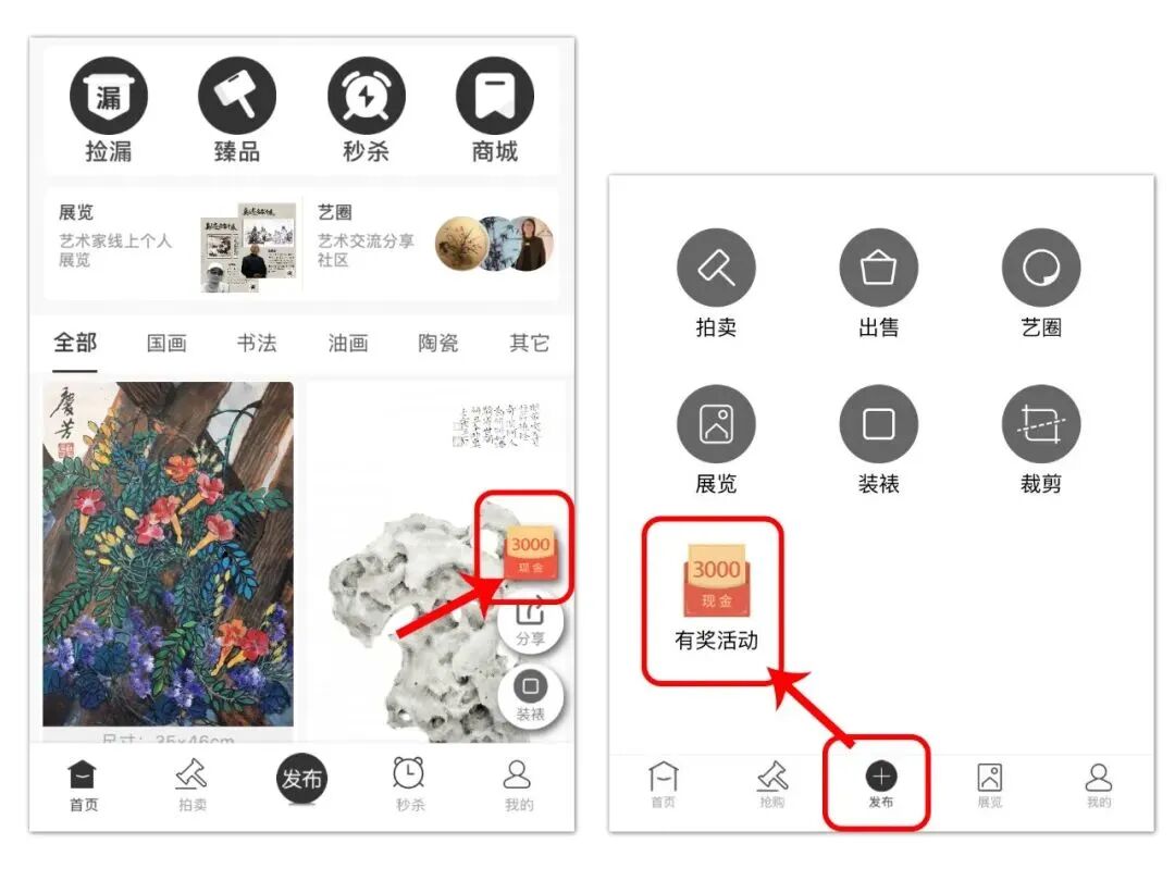 进入真迹书画小程序(或将真迹APP升级到最新版本)在“我的”--“发布”--“有奖活动”进入(或是在首页右下角的红色图标进入)可以参与: