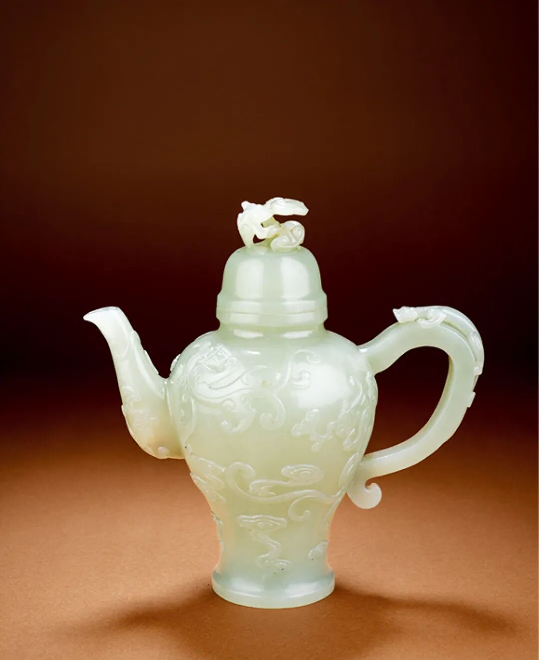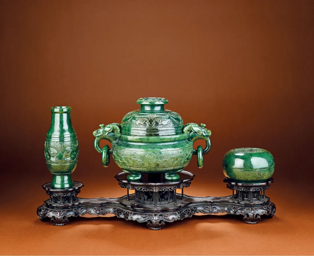 这组碧玉雕兽面纹炉瓶盒三式,玉质清冽冰洁,炉作仿古铜鼎形状,瓶长颈,鼓腹,并饰有兽面纹纹。盒呈扁圆形,盒身纹饰与炉、瓶相合。整体组合严整大气,典雅华贵。
