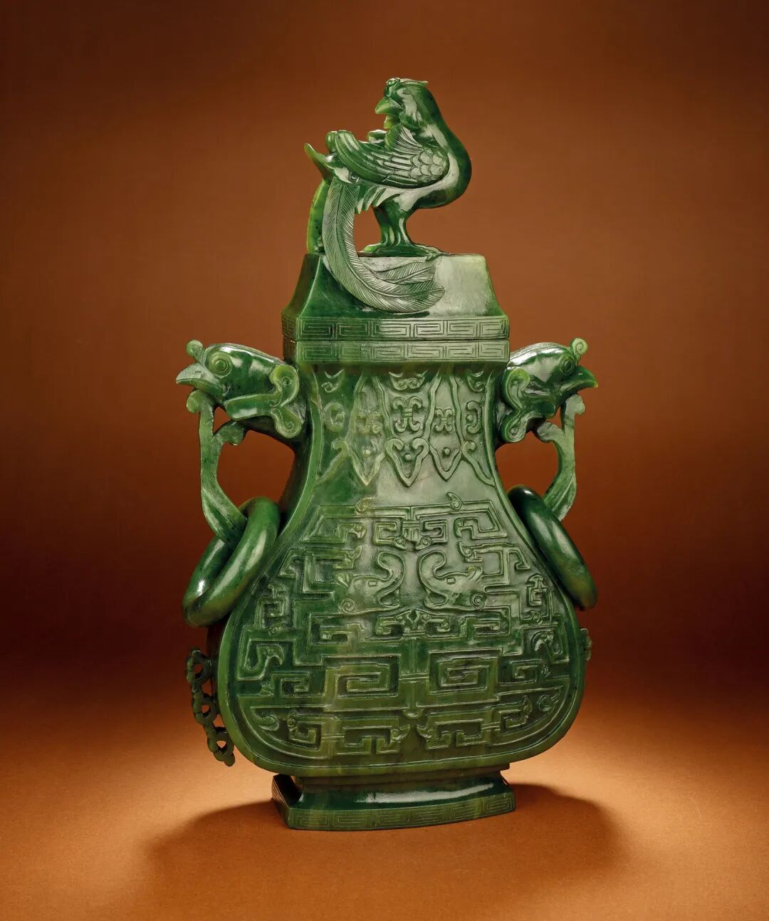 说明:翡翠为料,瓶体呈圆形。椭圆形口、足,长颈,鼓腹,颈两侧饰对称双象耳形环,盖平钮,瓶身双面开光,绘寿字纹饰,玉质纯净,莹润无暇,质地细腻俏色部分发色艳丽老辣,端庄大气。