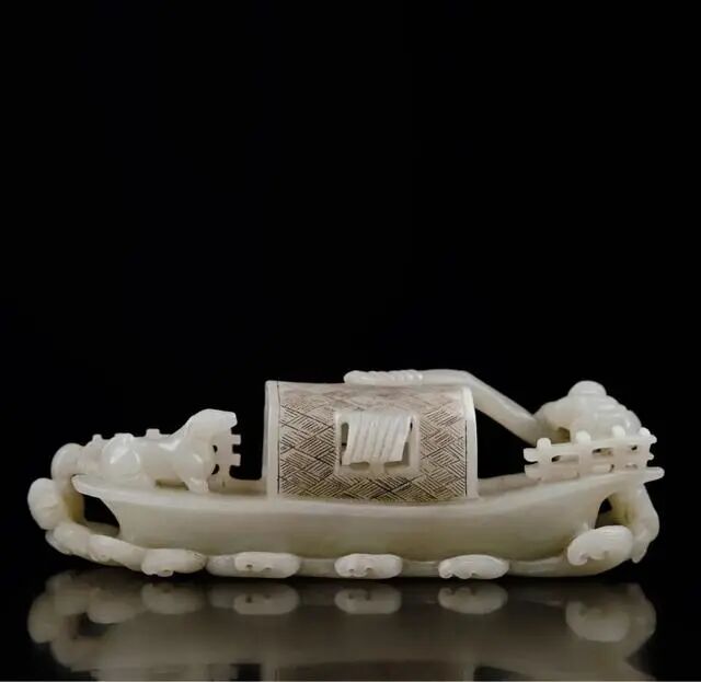 此件和田玉雕船舶摆件,包浆油润,局部微黄沁色,品相上乘,雕工精湛,船篷作镂空状、纹路清楚,前后雕有镂空栏杆,一犬卧于船头,一鸭游于水中,船尾渔夫手执摇橹作撑船姿势,人与动物和谐自然,意境优美,妙趣横生。