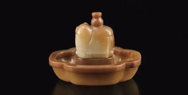 此香插采用和田黄玉雕琢而成,分上下两部分,上部雕刻一只大象,象背驼着一个瓶子形的香插,大象浑厚饱满,气势磅礴,皮壳包浆厚重。下部雕刻海棠形盏托,大象立于盏托正凸出的方台之上,象,瑞兽,厚重稳行,故有“太平有象”、“喜象升平”之说,寓意河清海晏、民康物阜。整器造型古朴小巧,为案上清供,甚是可人。