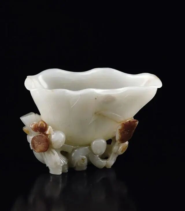 此杯采用和田玉籽料雕琢而成,造型精巧,玉质温润细腻,包浆沉稳,雕刻技艺精湛。荷叶口,杯身阴刻有荷叶纹饰,在杯底雕有荷叶纹以及采莲的童子,描绘出荷塘的场面,题材和谐,表现生动。
