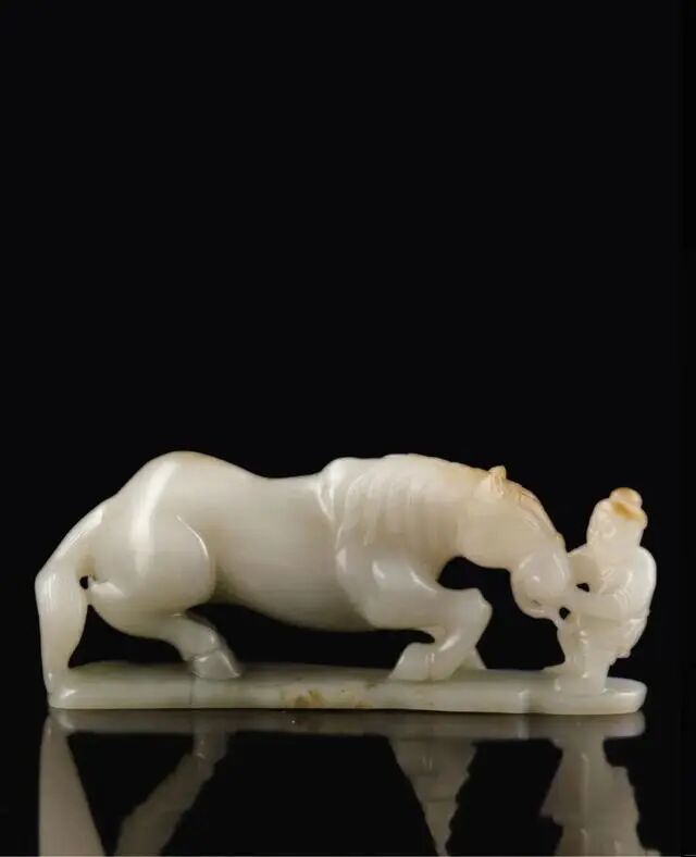 此器玉质细腻温润,立体圆雕胡人牵马形象,骏马四肢矫健,肌肉硕健,彰显美感与力量。胡人双手紧握缰绳,呈半蹲状,栩栩如生。整器形态写实逼真,粗犷的线条雕刻与细腻的鬃毛形成鲜明的对比,尽显古朴之美。
