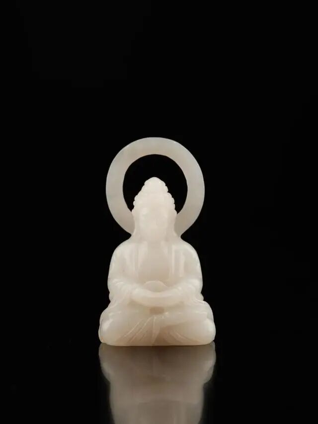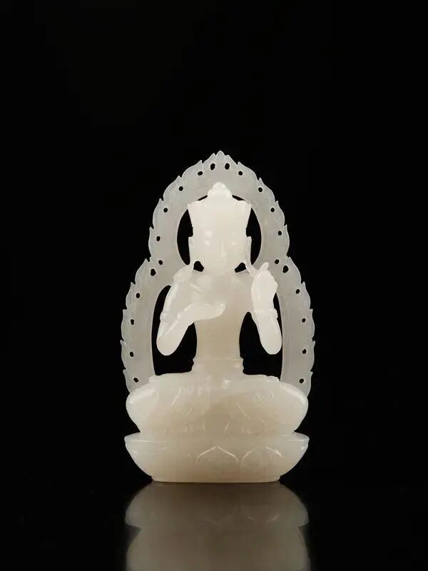 和田籽料暖白细腻,玉质柔和,油性十足。整器庄严大气,刀法流利而精湛,极富表现力。大日如来开脸饱满,法相端严,神态温和,形态雍容,佛光普照。五官刻画细腻,弯眉长目,大耳垂肩,身上服饰线条流畅,气质端庄祥和。