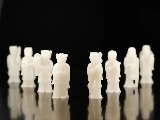 八仙从左至右依次是:张果老、吕洞宾、蓝采和、何仙姑、铁拐李、曹国舅、钟离权、韩湘子,八仙过海,各显神通,在玉雕中,八仙各自手持法器,意为护佑平安顺遂。此套八仙有的如幼童俏皮可爱,有的举着拐杖,有的开脸圆润慈祥,有的长须飘逸,有的笑容满面,姿态各异,组成一幅其乐融融的画面。此八仙摆件人物完整,玉质油润,雕刻生动传神。