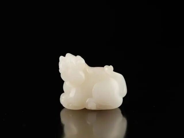 此作由和田玉雕刻而成,玉质细腻温润,造型小巧可爱,獬豸又称獬廌、解豸 (xiè zhì),是中国古代神话传说中的神兽,体形大者如牛,小者如羊,类似麒麟,全身长着浓密黝黑的毛,双目明亮有神,额上通常长一角。獬豸拥有很高的智慧,懂人言知人性。它怒目圆睁,能辨是非曲直,它能辨曲直,又有神羊之称,它是勇猛、公正的象征,是司法 " 正大光明 " " 清平公正 "" 光明天下 " 的象征。