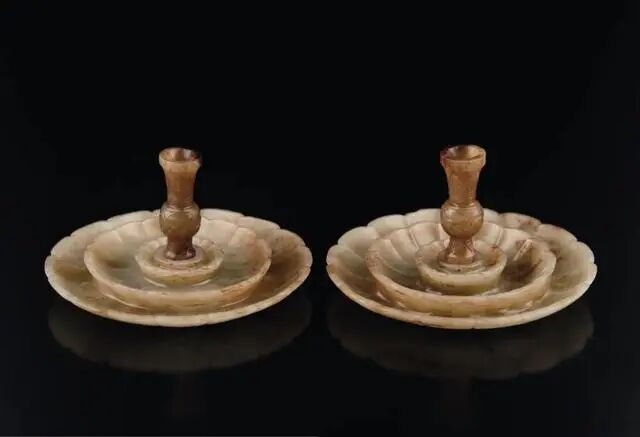 Lot 136 明代 和田玉雕菊花形兽面蕉叶回纹烛台一对