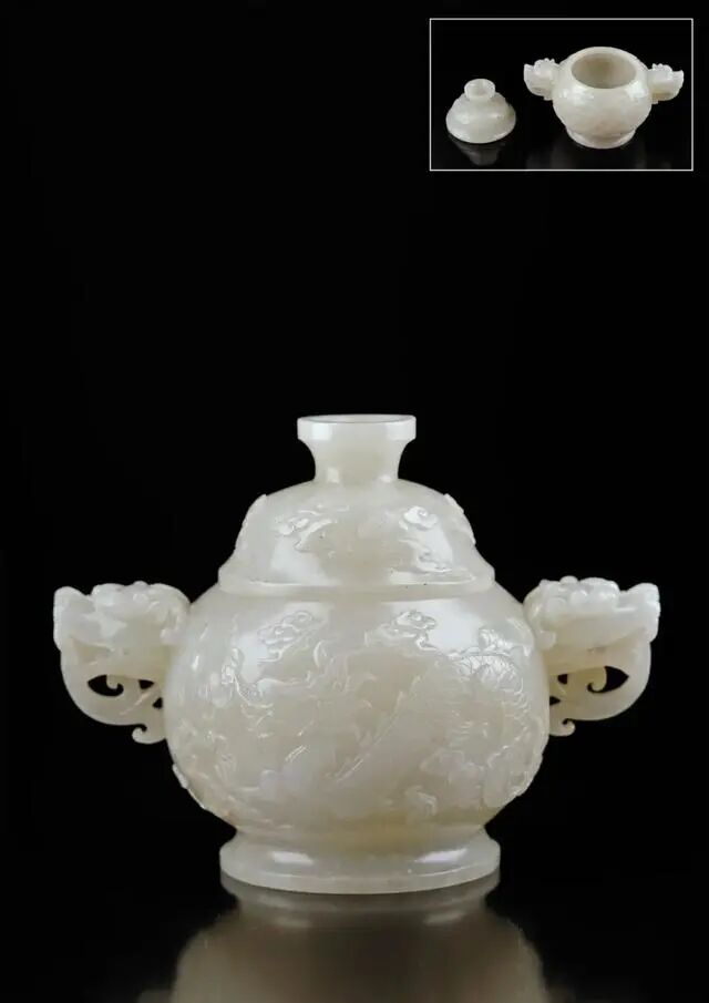 Lot 181 明代 和田玉云龙戏珠双兽耳盖罐