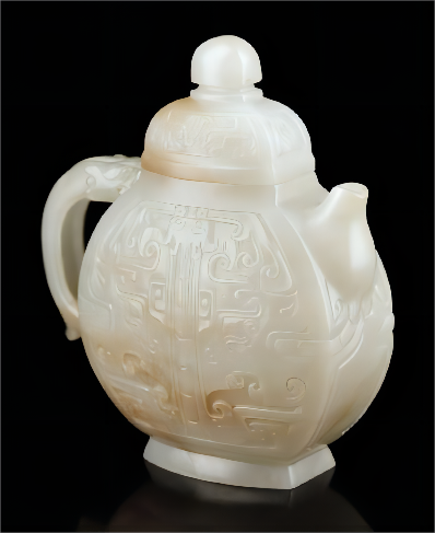 此壶以和田玉为材,玉质莹洁细腻,温润如凝脂,且料大质佳,略带沁色,颇为难得。短流口,C 型龙为把,瓶盖造型规整,线条流畅,瓶体呈扁方状,瓶盖与瓶体均已浮雕技法雕刻饕餮纹,运刀修整极为细腻,雕琢工艺娴熟精湛,整器纹饰布局合理,无论选材、纹饰、雕工、意蕴,均堪称上乘之作。饕餮纹,青铜器上常见的花纹之一,最早见于长江中下游地区的良渚文化陶器和玉器上,盛行于商代至西周早期。此瓶上的饕餮纹,面部巨大而夸张,线条雄健,配上玉石的坚韧材质和温润质感,积淀着一股深处的历史力量。
