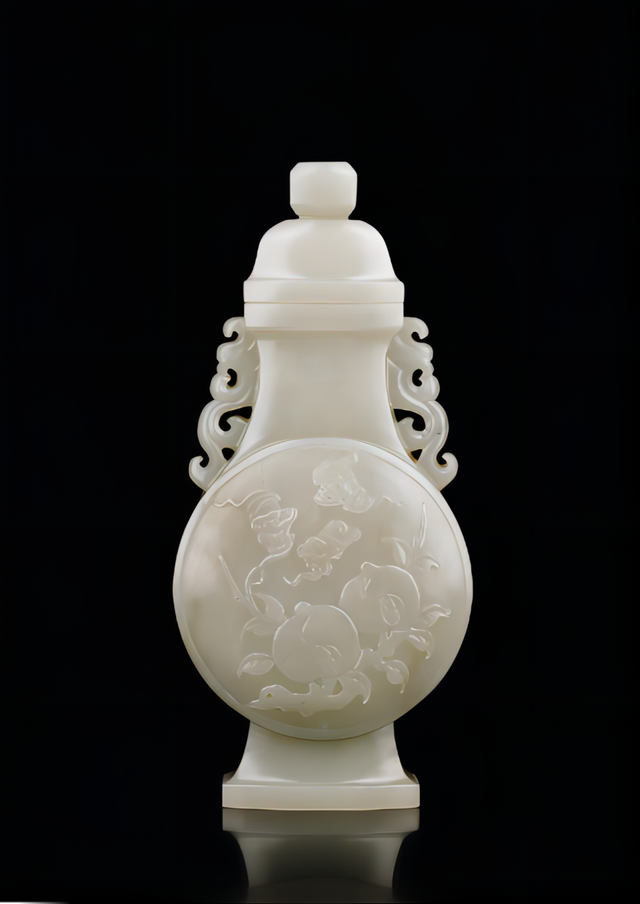 器身扁瓶,正面唇口直颈,溜肩,圆腹,下设台几式足,器顶设盖,上带圆形捉钮。此瓶以上等和田玉料掏空雕刻而成,玉质莹润细腻,造型雅致规整,瓶身雕刻祥云围绕寿桃图案,螭龙耳,纹饰布局合理,具有浓郁的中国传统人文风格。