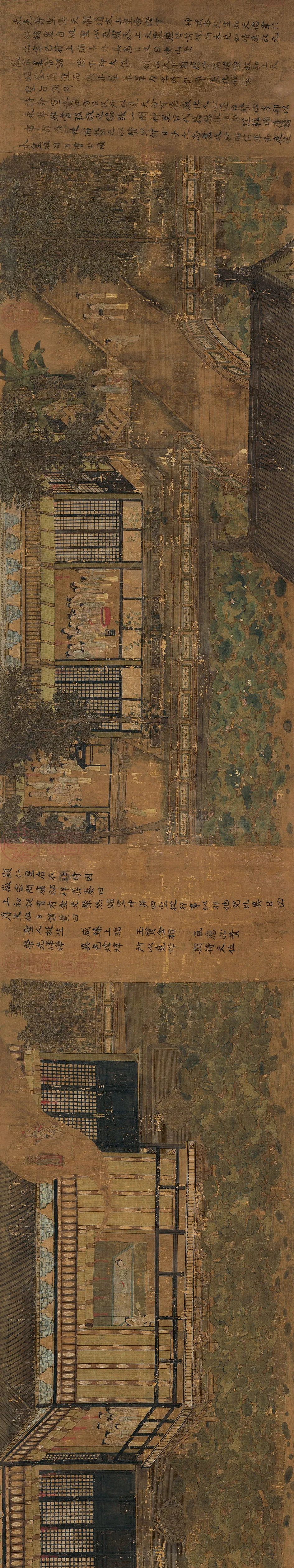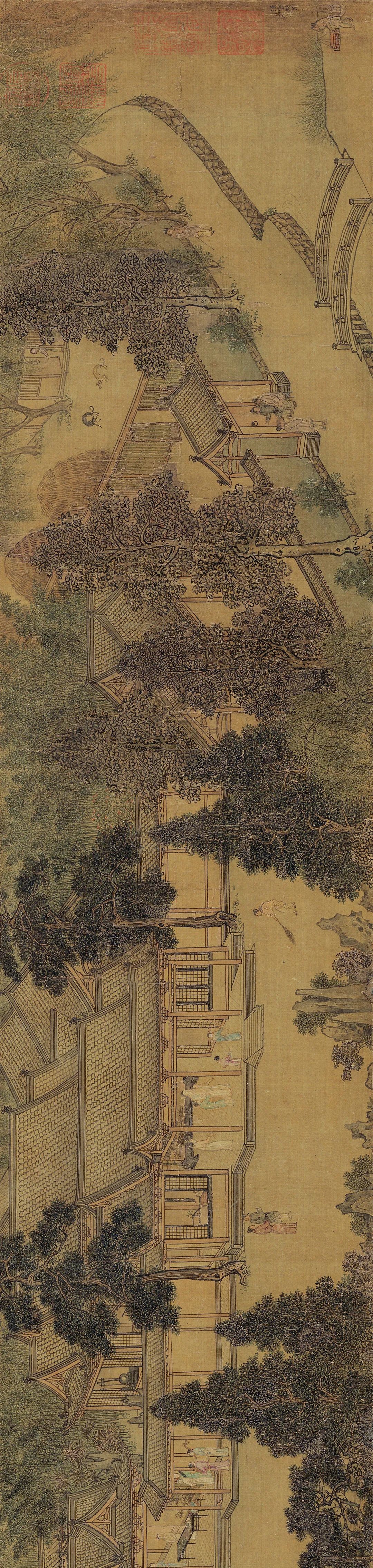 本件《汉宫秋图》即以汉武帝甘泉宫侯候约西王母为题材创作的一幅画卷。