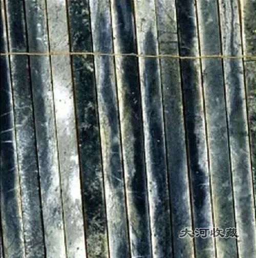 玉简册。河南辉县固围村1号大墓1950年出土。简长22.5厘米,一组50件。青玉白斑。简面无字,是否剥落还是原本无字,已无确证。战国玉简发现不多。是研究当时葬俗和简册的重要资料。