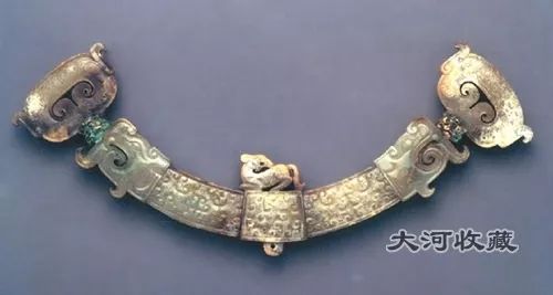 鎏金嵌玉镶琉璃银带钩。战国(魏),长18.7厘米、宽4.9厘米。1950年河南辉县固围村五号墓出土。