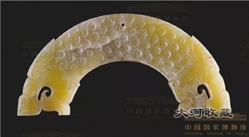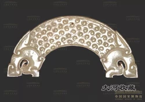 谷纹双龙首玉璜战国(魏)。河南辉县固围村大墓出土。长9.4厘米,宽2.1厘米。