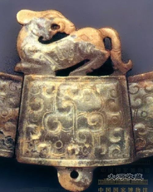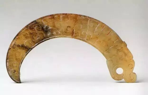 璜是一种弧形片状玉器,形状一般为璧的三分之一或四分之一,其两端多作龙首或兽首,主要用作胸前佩饰。这件玉璜由七块白玉和两个鎏金铜兽首组成,玉质细腻,光泽粲然。中部五块玉的内心穿孔,以铜片缀连,中间一块玉上雕回首卧兽,下有鼻钮,通体作龙纹及变形云纹。《周礼·春官·大宗伯》:“以玄璜以礼北方”,玉璜是祭祀北方玄武之神的礼器,亦常用作朝聘、祭祀、丧葬。这件玉璜形制和纹饰都极为精美,器形硕大,被誉为"古玉之巨擘"、“玉器之冠冕”,代表了战国时期玉器制作的最高水平。