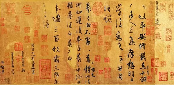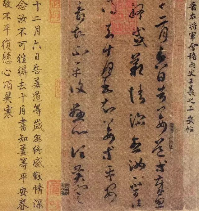 《草书平安帖》又名《告姜道帖》,最早见于北宋著名丛帖《绛帖》,后经《宣和书谱》著录,当时共有九行,后被一分为二。上帖是前半部,为绢本,纵24.5厘米,横13.8厘米,共4行,41个字。《草书平安帖》上并没有作者的名款,但历史上大多数人都认为是王羲之所书。延展开这幅草书帖,41个字的周围盖满了几十方收藏鉴赏印章,可见其在漫长的历史长河中曾屡次易主。乾隆帝盛誉该帖“可亚时晴”,媲美“三希堂”瑰宝王羲之《快雪时晴帖》,民间流传王羲之高古摹本无出其右。