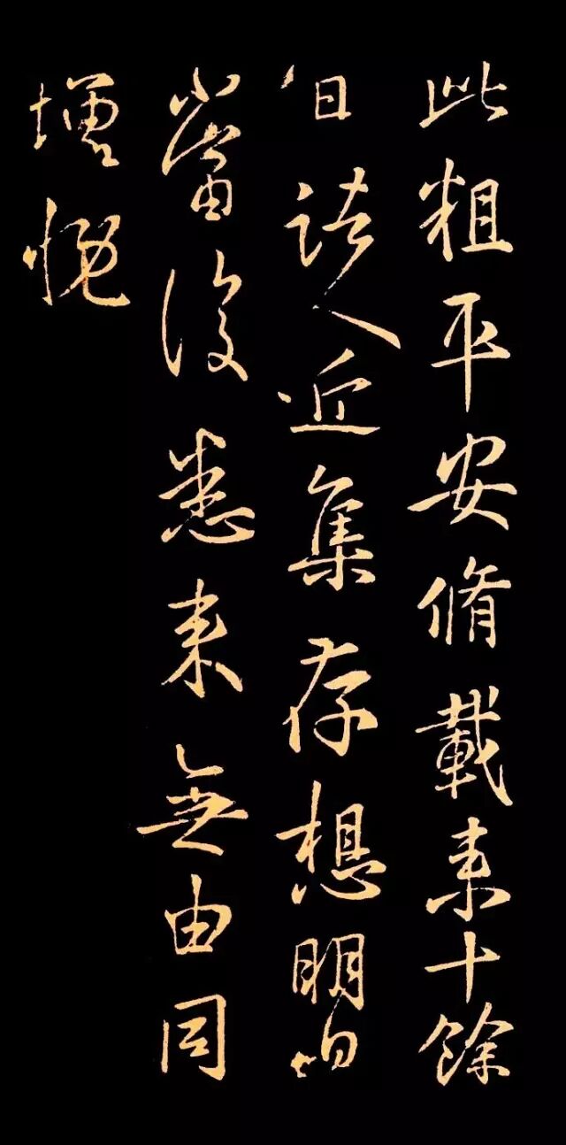 《平安帖》结字一般是取正局的,即不作作过多的欹侧,这容易形成排布,排布也就是状如算子,所以,处理好变化仍然是十分重要的。取正局又给人以多变的感受,一般来说,细微部分的变化要求就要高些。此帖中,最明显的变化是轻重变化。整体上看,帖右上部分轻,左下部分重。逐行看,第一行的轻重变化不大,但每个字的内部是很有味道的。如“安”字,每一笔都用曲,中横的弯曲更是明显,整个字又稳如泰山。“载”字的土字头写法奇,车旁好像塞在半包围的框中。“来”、“余”的笔致变化,真有纸上舞蹈的韵味。类似的这此变化,保持始终,这便增加了“可读性”。当然,王羲之这些变化,不是“计划”来的,虽然有意在笔先之说,但,意是玄妙的,并不是像做建筑工程一样,一步步去实现蓝图。第二行的轻重变化是明显的,一看便知。到第三行,行笔开始加快,写得随意了些,往往用了草书的写法。可以揣度,王羲之写《平安帖》时,心情是相对平和甚至是欣悦的。字很秀,很美,很挺拔,没有太大的波动。像“明日”这样的字,很流美;像“当复”,有凌空欲飞之势,这种感觉,只可意会,不可言传。我们在临帖的时候,当然主要是临字,其实,某种意义上说,也是临情绪,临节奏,临心态。此帖雄强潇洒,颇能体现当时的魏晋风度。用笔法度严谨、沉稳精到,又不失自然轻灵、明快畅达。观此幅作品,无一丝渣尘,若白璧无瑕、若精金美玉,其境界之高,非可强为,实乃羲之心手双畅之作。羲之变法,踵事而增华,变朴拙为姿媚,但其离古未远,大朴未散。此帖既有娟美之处,又不失古拙遗风,可谓朴拙相生,得中和之至美。