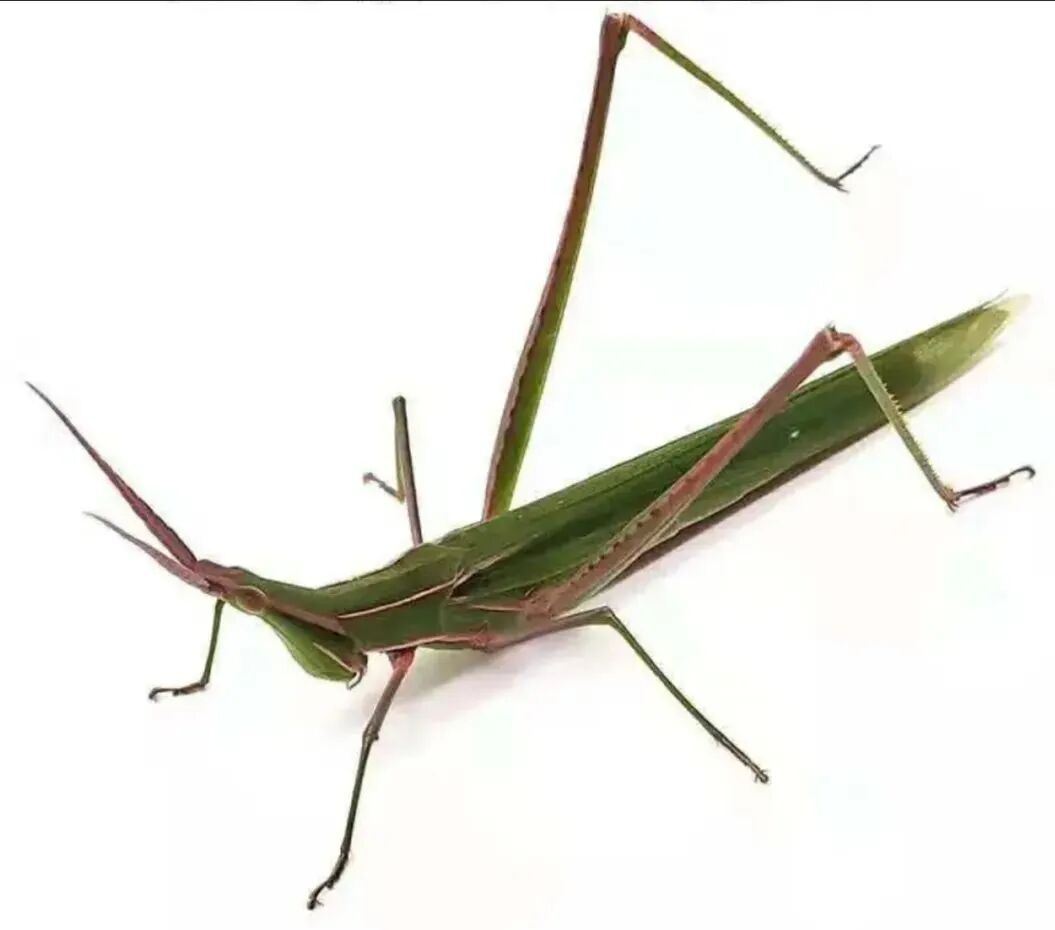 从水滴状头部与修长的翅膀,可以判断图中的原型是剑角蝗 (Acrida sp.)。![]()