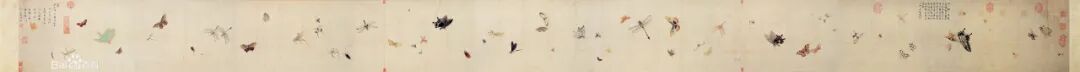 这件长卷里,一共画了七十只草虫,各个栩栩如生,而且笔力细健,色彩雅洁,是古代难得的写生而后集绘的佳作。此卷中有清乾隆帝在已卯年(1759)的题诗,诗中赞誉此作“蝇蝇栩栩各通灵,蠕动肖翅毕肖形。”卷末有画家自书题款,记录此画的创作时间和动机,以及“月余乃成”而“徜遇好事者,非曰金贰百不与易也”的珍视。