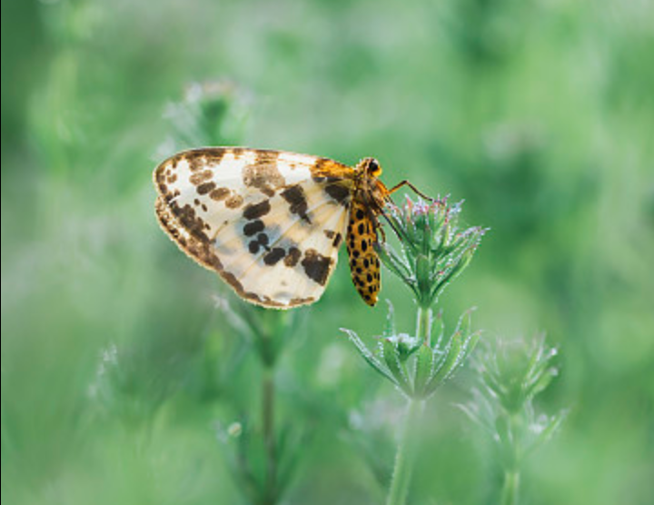 此图呈现蝴蝶翅膀合起的停栖状态,但头部的曲管式口器仍未完全收回,推测可能描绘的是停栖于花朵上的蝴蝶,正吸完花蜜收起口器。
