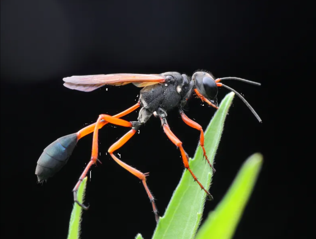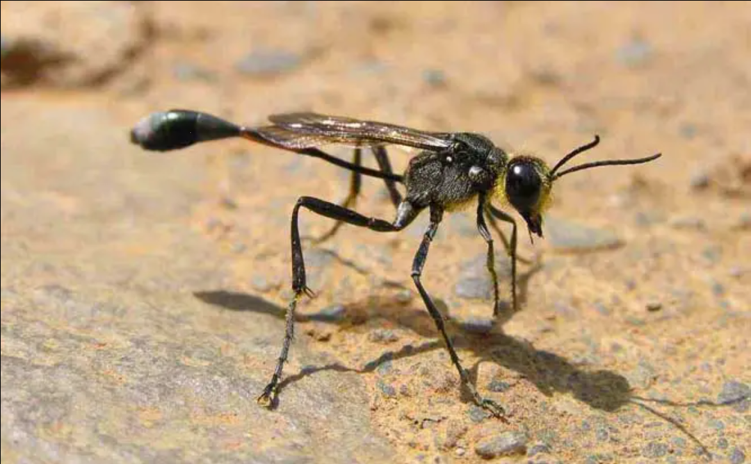 依据画中蜂的腹部有一细长管状构造,推测应为膜翅目细腰蜂科 (Sphecidae) 蜂类。