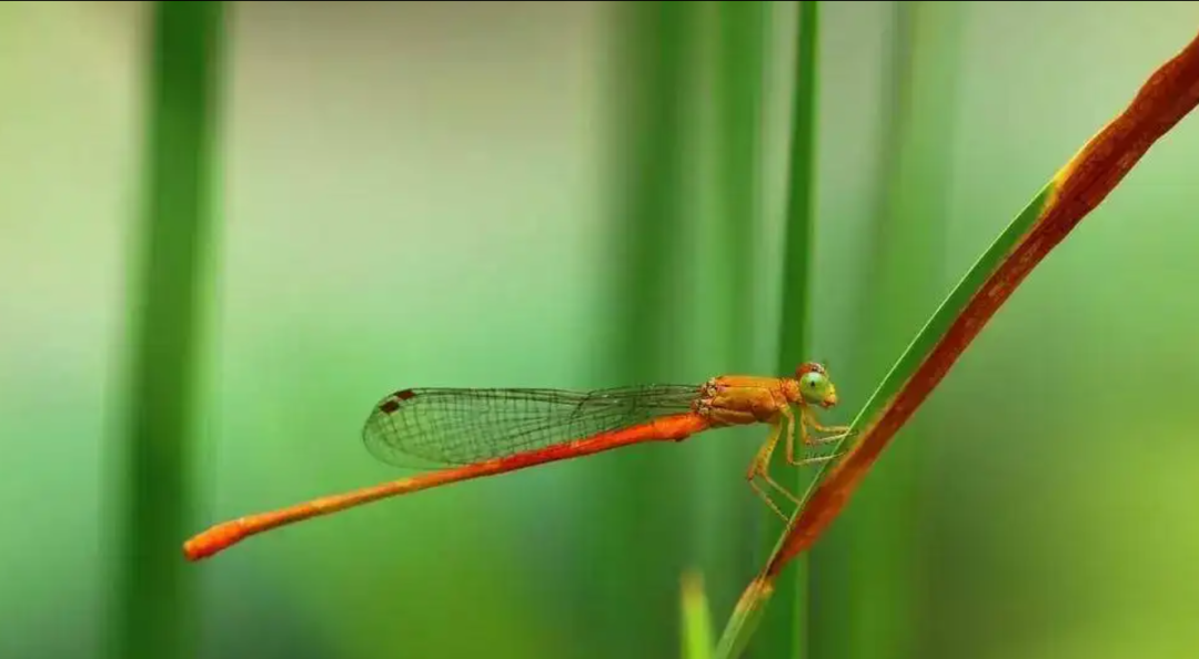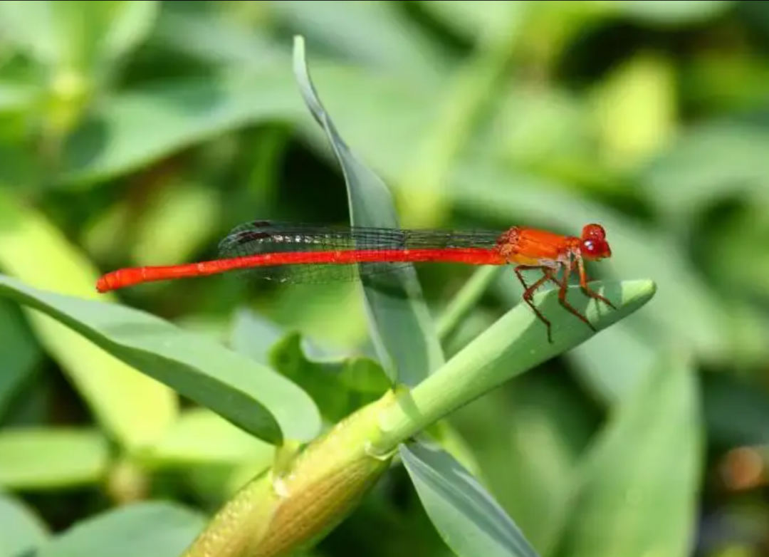 从绿色的复眼、红色合胸以及腹部等特征,研判可能为蜻蛉目的红腹细蟌。红腹细蟌分布在日本、中国等地。在中国台湾,红腹细蟌普遍栖息于平地至海拔一千公尺以下的池塘、沟渠或水田等静水域。成虫整年可见,算是相当常见之种类,有机会到这类栖地时不妨注意一下它们的倩影。![]()