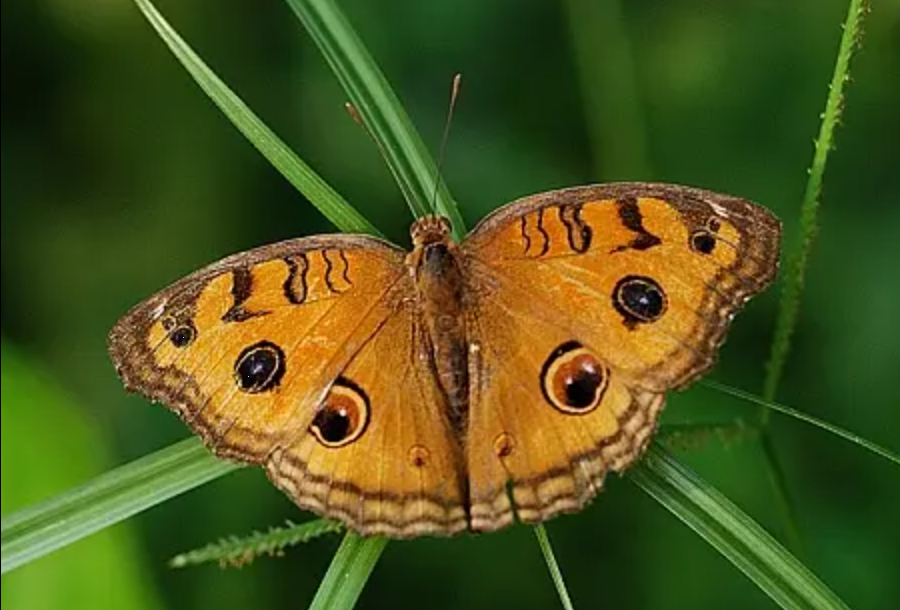 图中所绘蝴蝶有着明显的棒状触角,从翅的色泽与斑纹,加上圆斑等特性,推断应为蛱蝶科眼蝶亚科的昆虫。