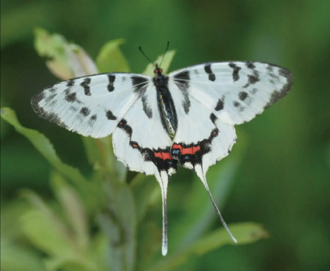 后翅尾突如此长者只有丝带凤蝶,但画中蝶前翅似雄蝶,后翅似雌蝶。