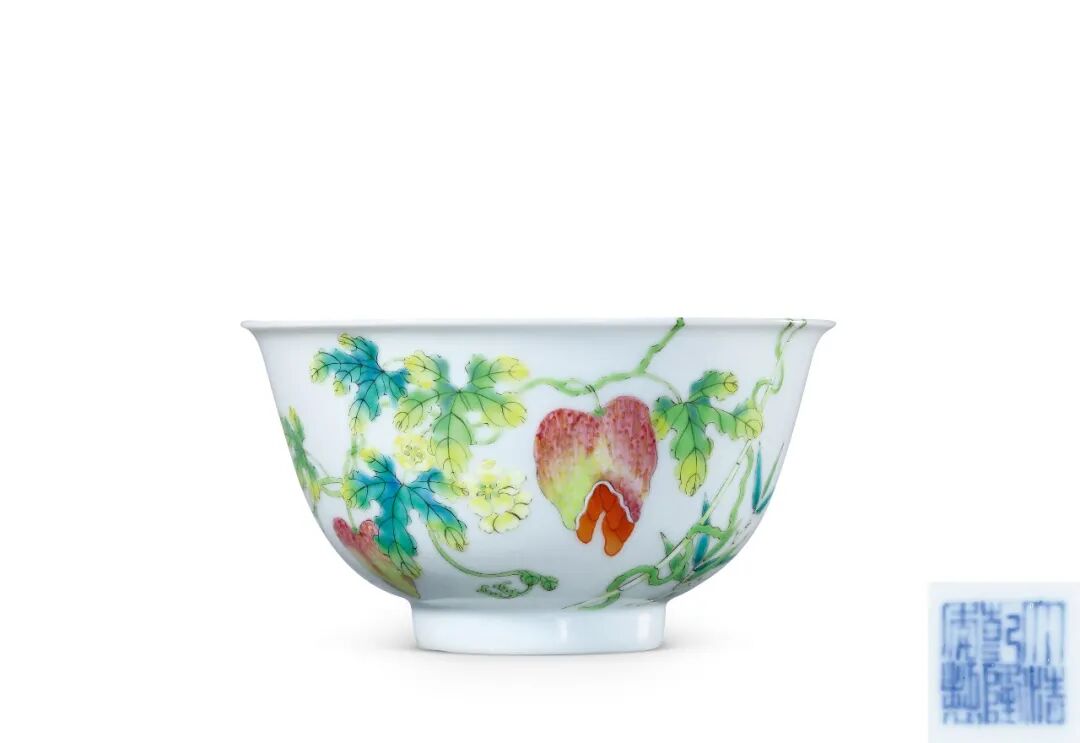 癞瓜又称癞葡萄,瓜面颗粒状凸起,成熟时颜色鲜艳,自然开裂,露出鲜红的瓜瓤,其籽多而饱满,故被认为有多子多福的美好寓意,清代常作为吉祥纹饰使用。粉彩过枝癞瓜图碗创烧于乾隆时期,后朝沿袭烧造迄于晚清,成为清代官窑经典制式。故宫博物院藏有清道光时期粉彩癞瓜纹碗,参见《孙瀛洲的陶瓷世界》,紫禁城出版社,页313。