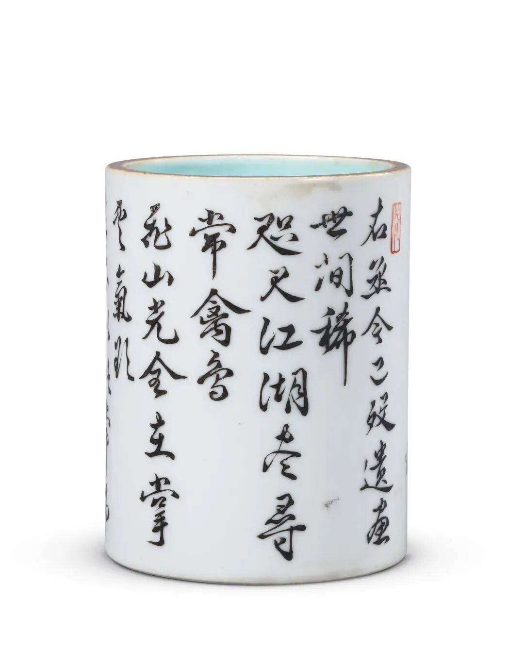 拍品极具文人风骨,整器墨彩书《题王右丞山水障二首》其一,小巧可人,制作考究,文气十足,难能可贵的是,笔筒底部不仅落款为“乾隆年制”四字双行篆书款,外壁亦书有纪年款“丙戌小春紫阳程珍并书”,由此可明确断定该品创作年代为乾隆三十一年春,为研究乾隆早中期作品脉络提供了明确参阅标准。“书”“画”“印”“款”俱佳,可称为文房珍器。
