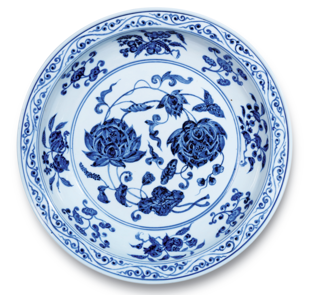 明成祖永乐皇帝尤重瓷艺,引领御窑瓷器成为空前绝后的艺术典范,开创之功甚伟,集古今之菁华,融中外之风格,隽品迭出,尤为精绝,其中青花一项,色泽深翠,式样精妙,青花一色秾美苍妍,布局疏朗而饱满,花果纹饰写实传神,充分借鉴国画的笔墨意韵。明代文人品评甚高,谓之“发古未有之名品”。永乐御瓷盘碗中较为珍稀,为永乐花果纹饰之隽品。正因为永乐青花御瓷独具静穆而高贵的表现力,彰显出中国陶瓷那份穿越时空、不可言喻的经典之美。