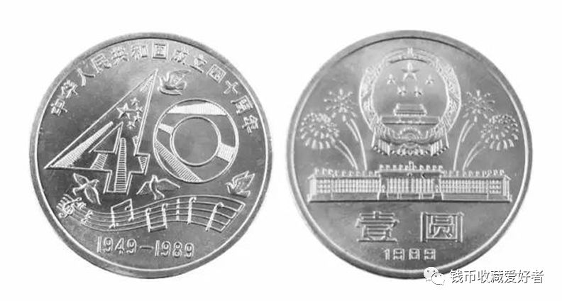 为庆祝中华人民共和国成立40周年,中国人民银行于1989年9月28日发行“中华人民共和国成立40周年”普通纪念币一枚,材料为铜镍合金,由沈阳造币厂铸造,直径30MM、重9.32克,发行量2100万,采用连续丝齿防伪。