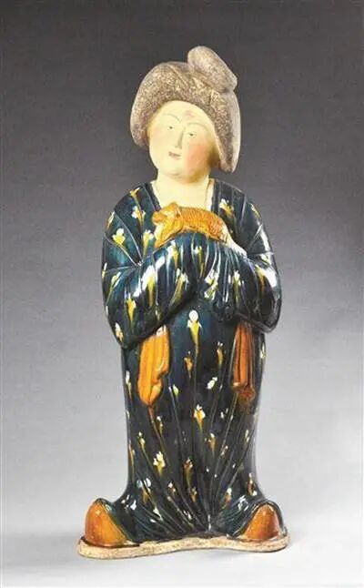 从唐代三彩陶的外观来看,它的特点是圆润饱满,造型更自然,线条流畅感强,人物活泼;从胎质来看,胎土更细腻,胎料为白中带浅红、浅黄,内含物较多矿物。