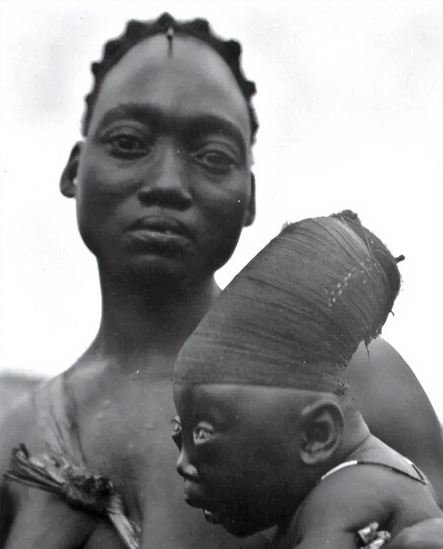 这是非洲芒贝图部落里的一对母子,可能是部落原始习俗的缘故,孩子的头部被亚面布缠绕了好几层,而它的母亲却只能默默流泪。