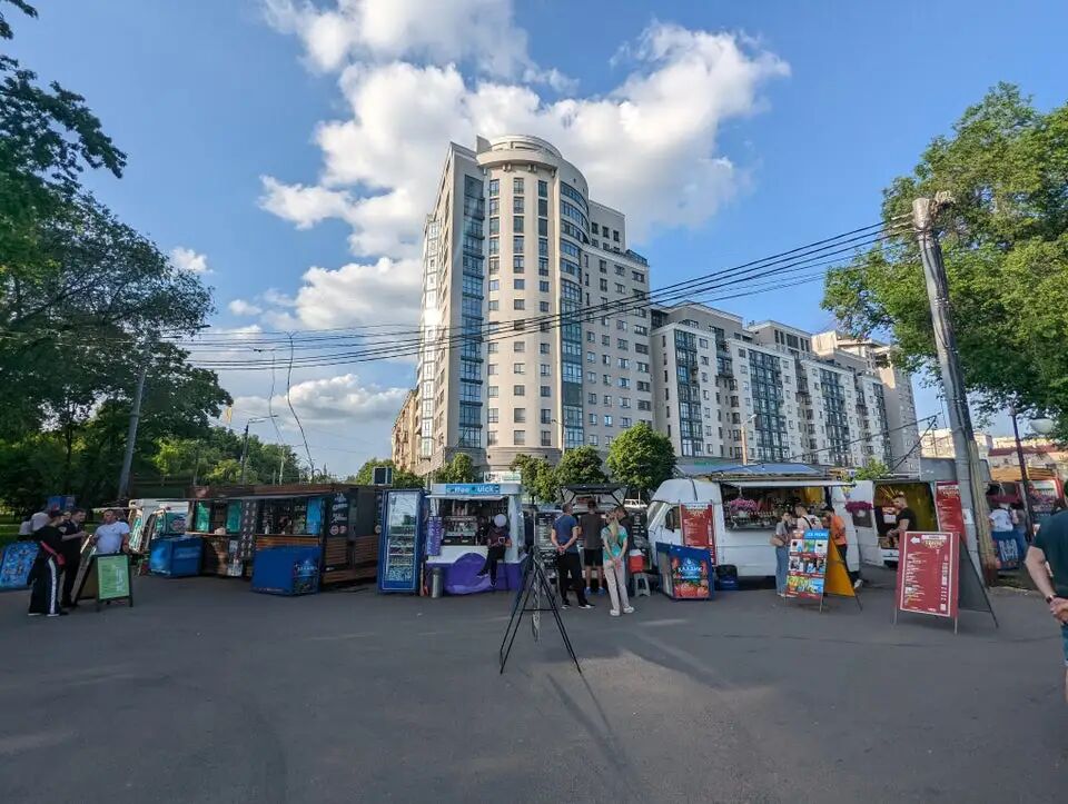 位于疫情过后的乌克兰哈尔科夫的商业街,刚刚出现人流的街上,各色各样的流动摊贩都开始相继出来营业。