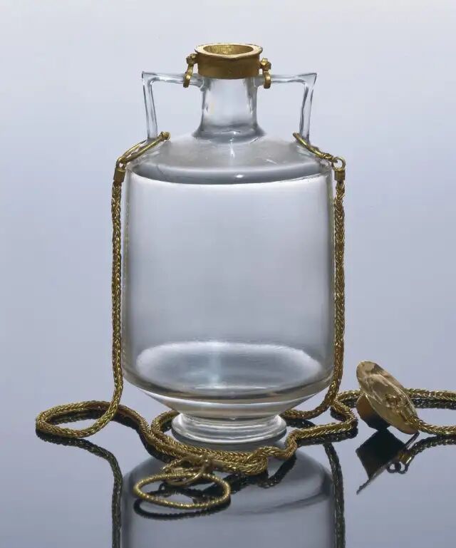 这是罗马1世纪时的香水瓶,金色的瓶盖和洗金丝线编织出的线,在那个不甚发达的年代,能够制造出这样的实属不易。
