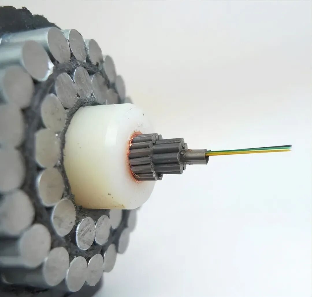 这是一根海底光纤的横截面,为了能够抵御海底巨大的压力,因此在只有几根细细的光纤外面,包裹了两层厚厚的钢筋。