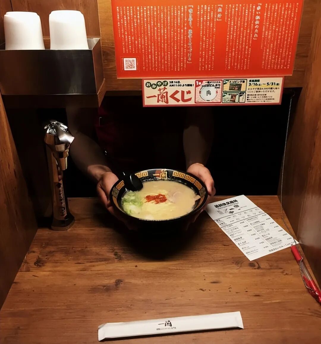 这是日本的私人拉面馆,拉面师傅做完拉面后,会通过这个小孔把拉面放在木桌上,这样顾客就可以在隔间里肆意吃面。