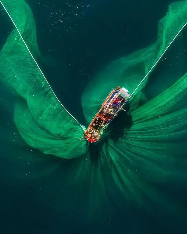 这是一个在湖水中心撒网的小型游船,从它的上方看上去,确是像极了一幅十分动人的水墨画。