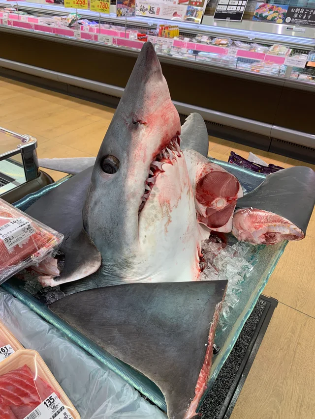 这是日本的超市里出售的鲨鱼肉,看着鲨鱼头这恐怖的样子,不知道它们是如何下的去口的。