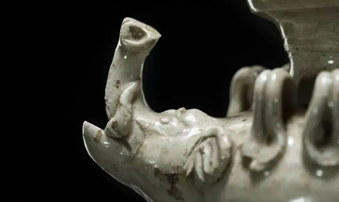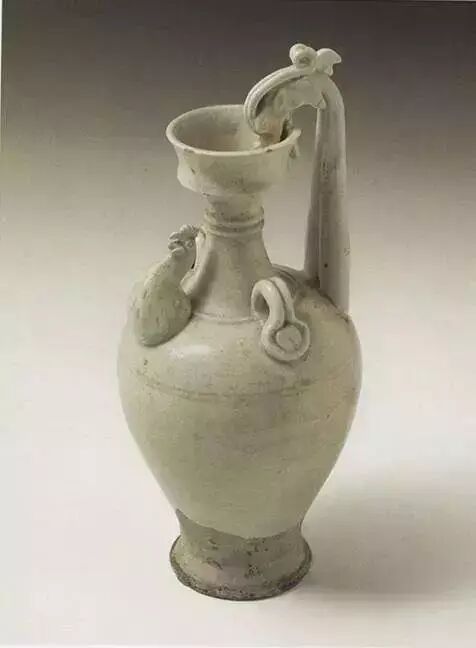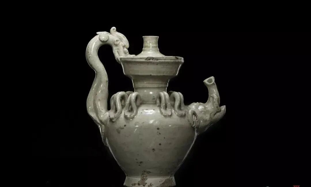 白釉龙柄象首壶 ,安阳相州窑烧制,1959年河南省安阳市张盛墓出土,现藏于河南博物院。壶高15厘米,小管状口,平顶面,似为盖,器盖与器身连为一体,不能分开,无法使用,应属明器。下接较深的盘口,边壁外敞。细颈,丰肩,一龙攀附于壶口与肩部,龙口衔盖,龙背高高拱起,成为鋬手。对称位置装饰象首形状的壶流,象耳如扇,鼻如圆筒,嘴巴张开,嘴里冒出两根长长的象牙,两眼圆瞪,长鼻高抬。肩部还装饰有成对的双泥条拱形系共八个。鼓腹,下腹斜收,饼形足外撇。壶体附加装饰繁缛,造型奇特,极富想象力。![]()