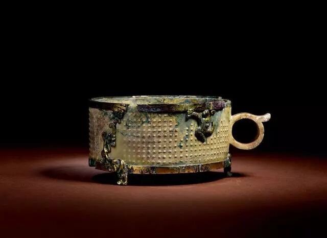 汉 玉勾连谷纹卮(带青铜鎏金座)
