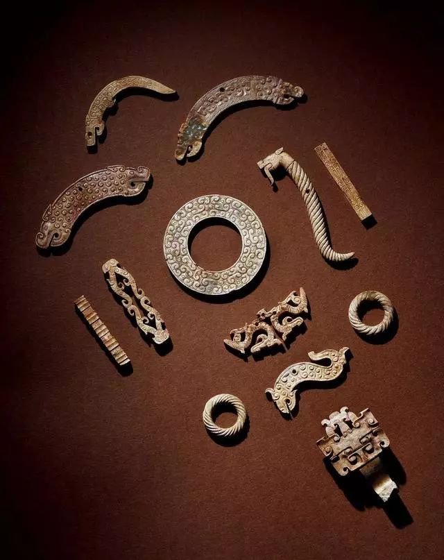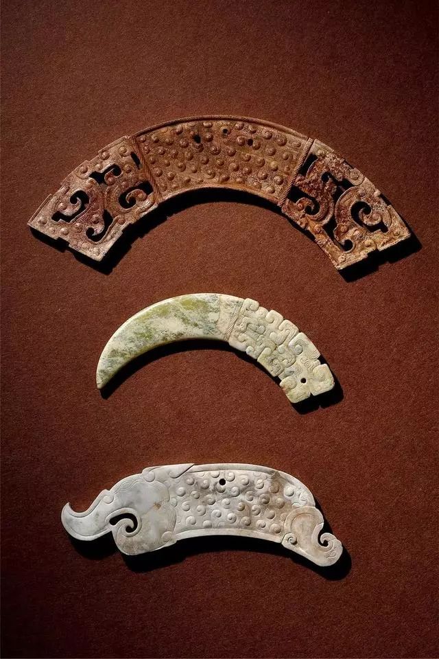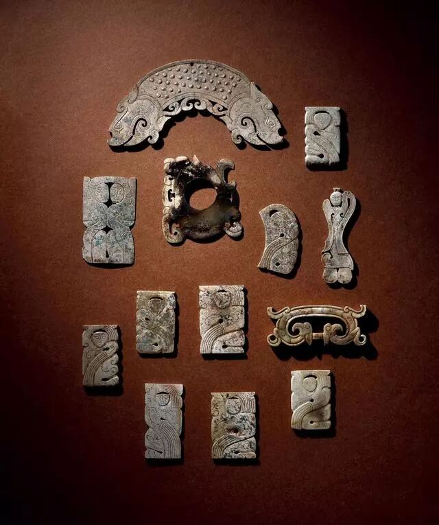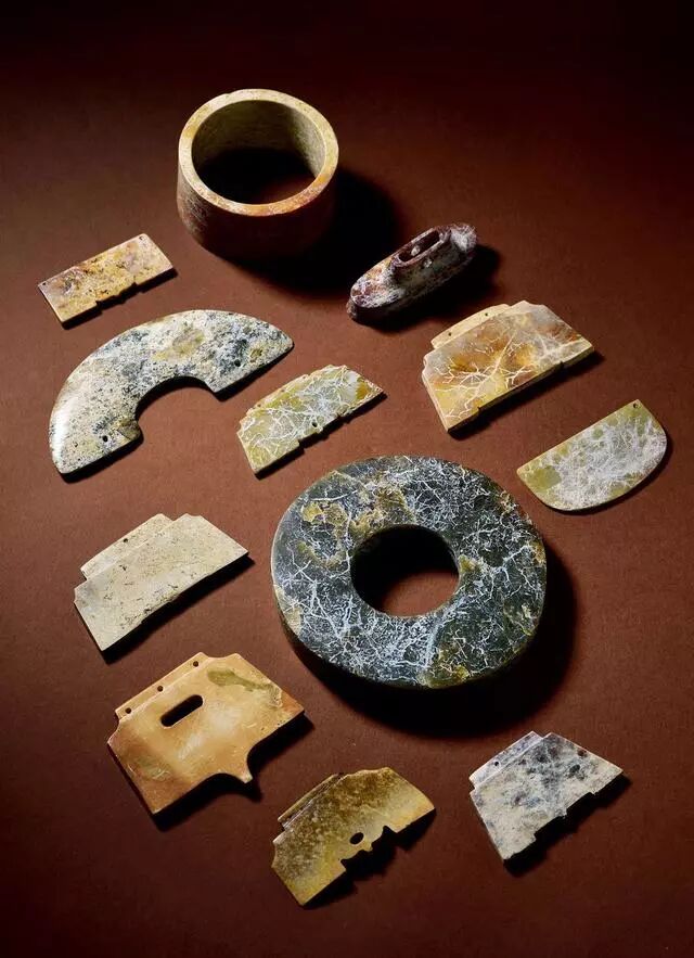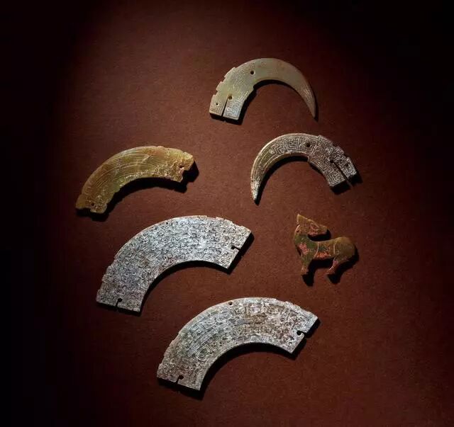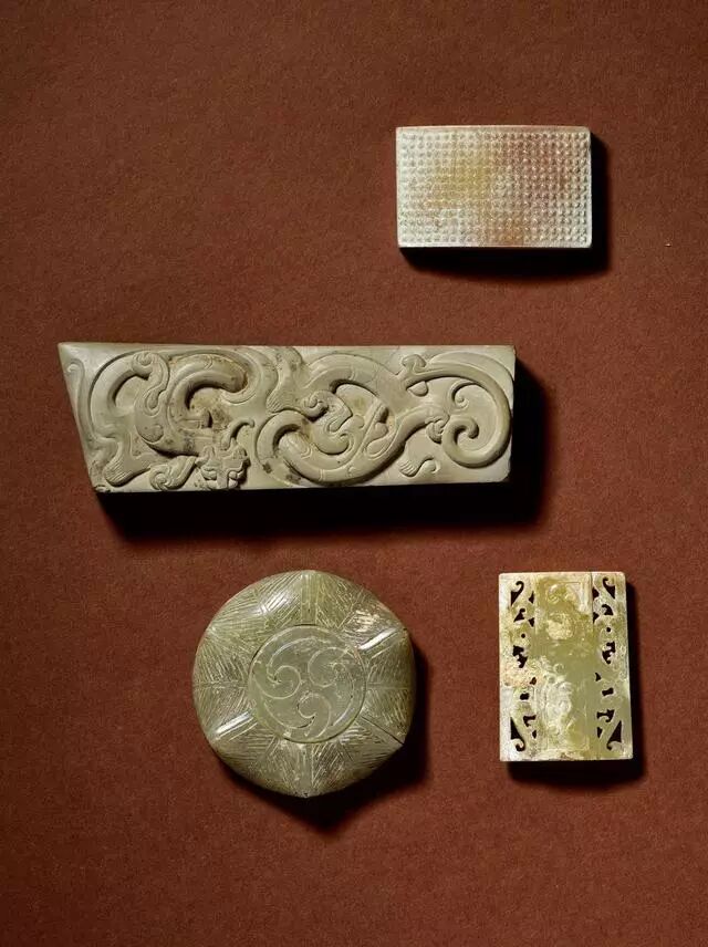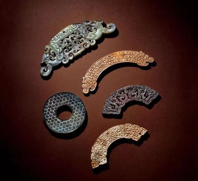 玉龙首谷纹璜三件、玉镂雕盘龙纹璜和玉谷纹璧各一件